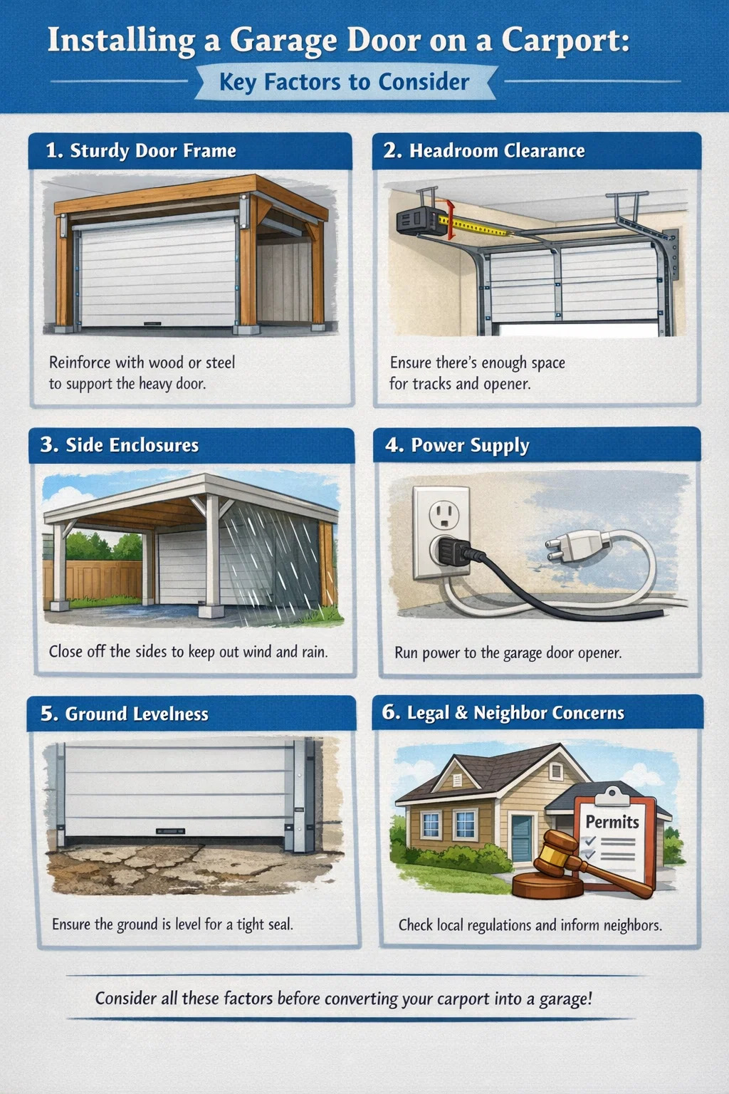 Ответ — да, но это не так просто, как просто купить дверь и повесить ее. Установка гаражных ворот на навесе для машины на самом деле является первым шагом на пути превращения его в настоящий гараж.