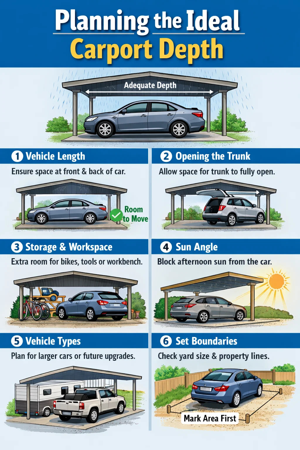 Хотя вы, возможно, захотите построить более глубокий навес для машины, вам также необходимо учитывать размер вашего двора.