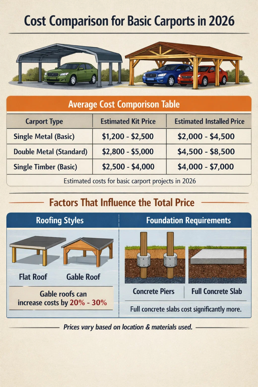 В следующей таблице представлено четкое сравнение сметных затрат в зависимости от размера и типа конструкции навеса для машины.