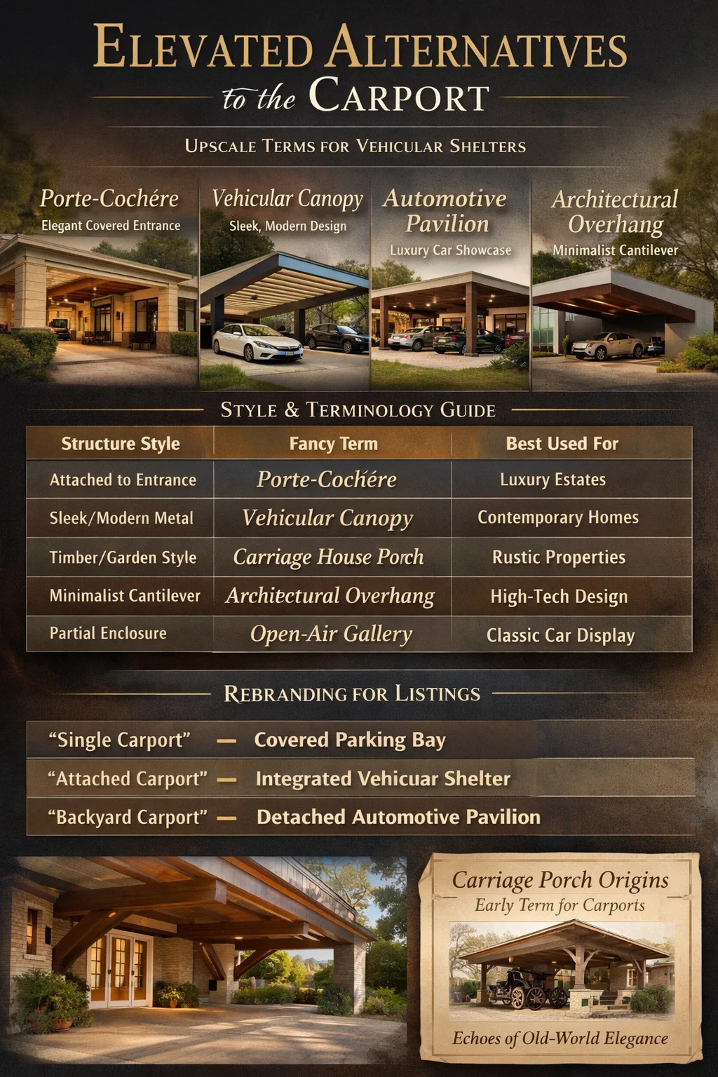 При описании конструкции, обеспечивающей защиту транспортных средств сверху, но не являющейся полностью закрытым гаражом, терминология играет огромную роль в восприятии ценности. Архитекторы часто избегают этого слова. навес для машины в пользу терминов, подчеркивающих интеграцию дизайна с ландшафтом или основным местом жительства.