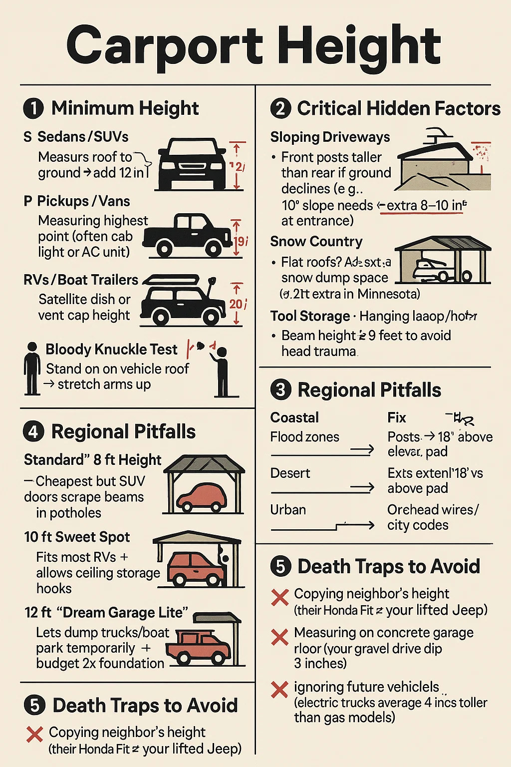 Снежная страна: → плоские крыши? Добавьте пространство снежного дампы (например, 2 фута в Миннесоте). → Стременные крыши? Высота на основе самого низкого края.
