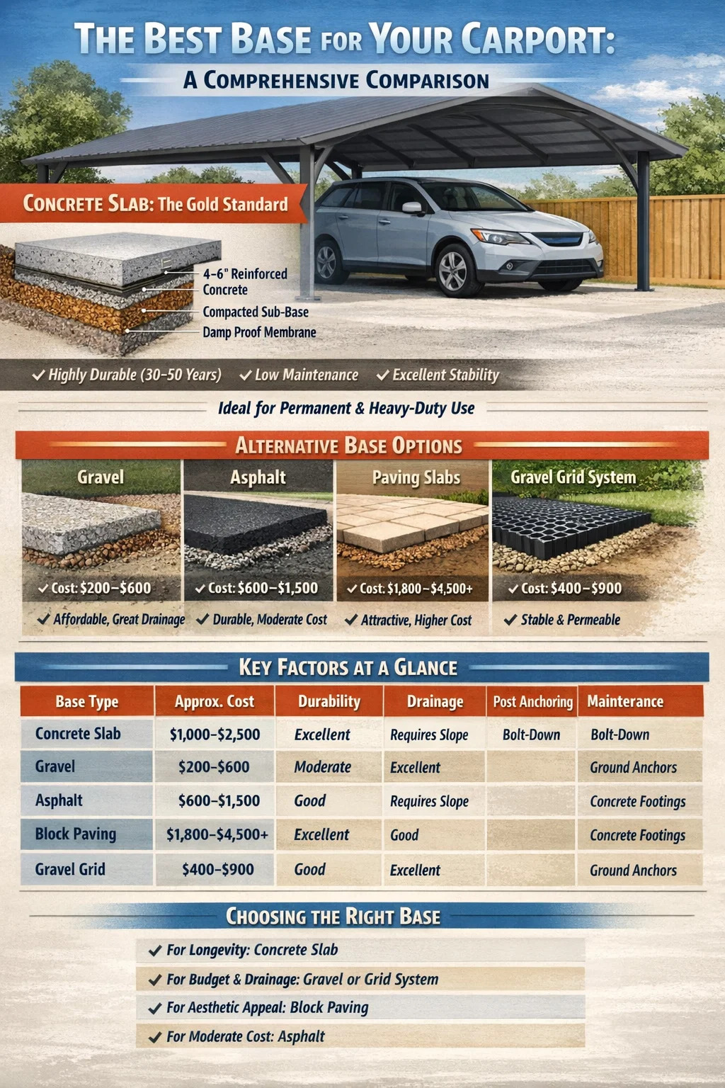 Способ соединения стоек навеса с основанием напрямую зависит от того, какой базовый материал вы выберете, и имеет серьезные структурные последствия. Рама навеса для автомобиля, которая не закреплена должным образом, подвергается серьезному риску подъема или бокового смещения при сильном ветре.