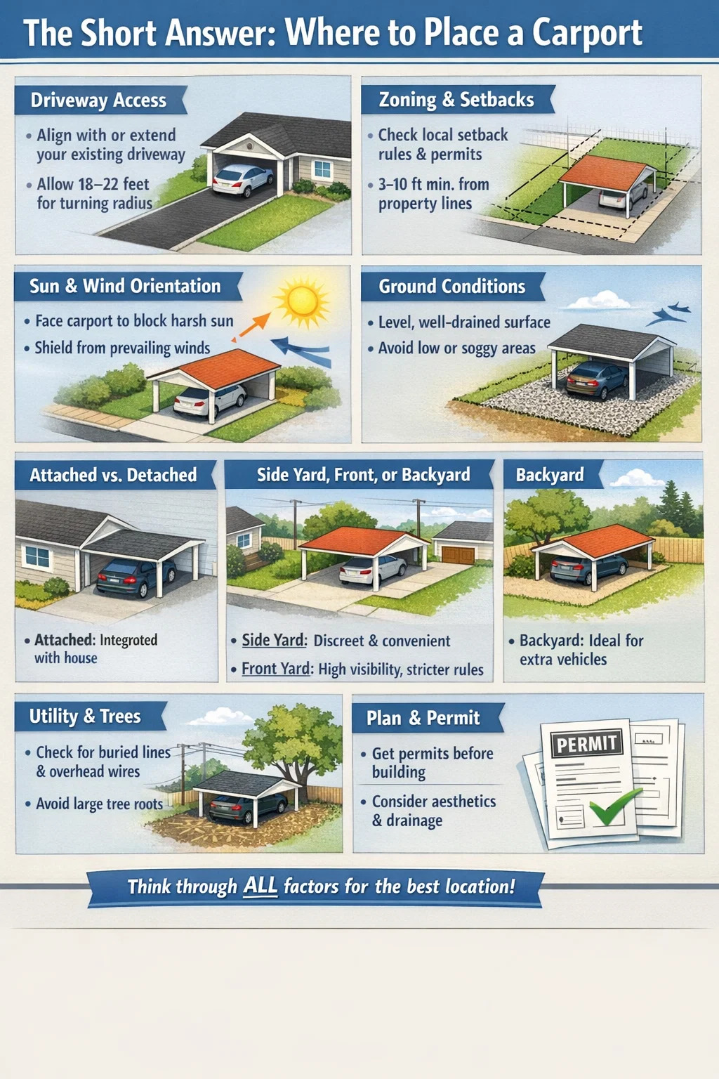 A carport should ideally be placed on the side or front of your home closest to the street or driveway access point, on level or gently sloping ground, with its open sides oriented to minimize direct sun exposure and prevailing wind. It must comply with local zoning setback rules — typically no closer than 3 to 10 feet from property lines — and should sit on a firm, well-drained surface such as concrete, asphalt, or compacted gravel.